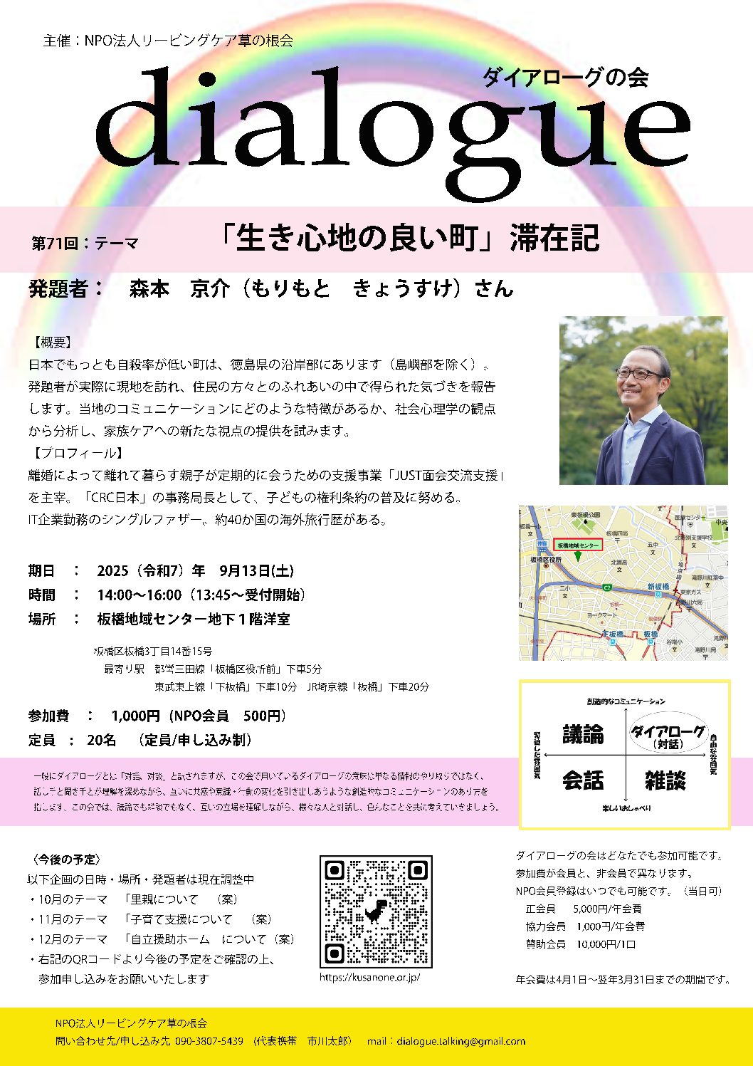 発題者が実際に現地を訪れ、住民の方々とのふれあいの中で得られた気づきを報告します。当地のコミュニケーションにどのような特徴があるか、社会心理学の観点から分析し、家族ケアへの新たな視点の提供を試みます。
